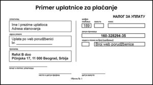 2. Uplatnicom na šalteru ili preko e-bankinga Plaćanje uplatnicom na šalteru ili plaćanje preke e-bankinga podrazumeva da nakon poručivanja i elektronske ili telefonske potvrde Vaše porudžbine, uplatite iznos sa predračuna (koji dobijate email-om) putem opšte uplatnice na šalteru pošte ili bilo koje poslovne banke, ili direktnom uplatom na račun REFOT B doo uz obavezno navođenje broja porudžbine u polju poziv na broj u slučaju plaćanja e-bankingom. Ukoliko kupujete kao pravno lice (firma), popunjava “nalog za prenos”. Detaljne podatke koje je potrebno navesti na uplatnici dobijate putem e-maila, neposredno nakon potvrde porudžbine. Po evidentiranju Vaše uplate, proizvodi sa porudžbenice se pakuju i šalju na adresu za isporuku
